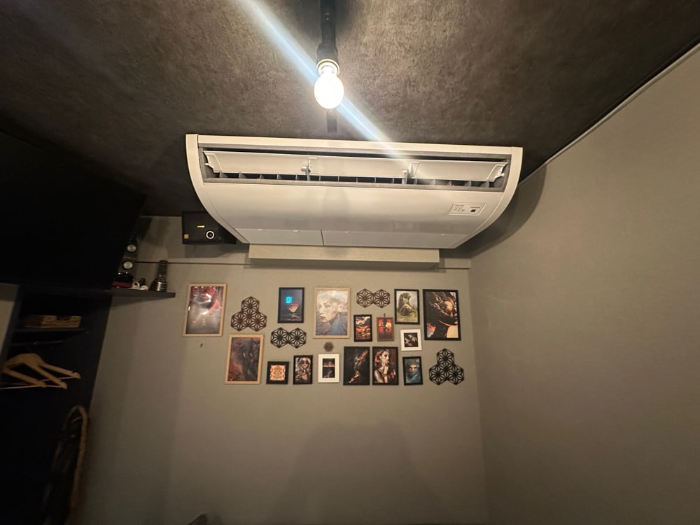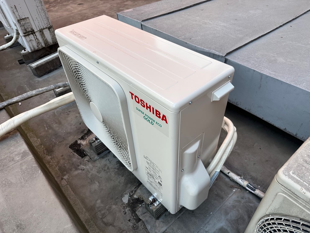 室外機置場が屋上で作業車が設置不可だった為、下から屋上までロープでの荷揚げ作業4人で見事に上げ下げが出来ました。職人さんお疲れさまでした。
