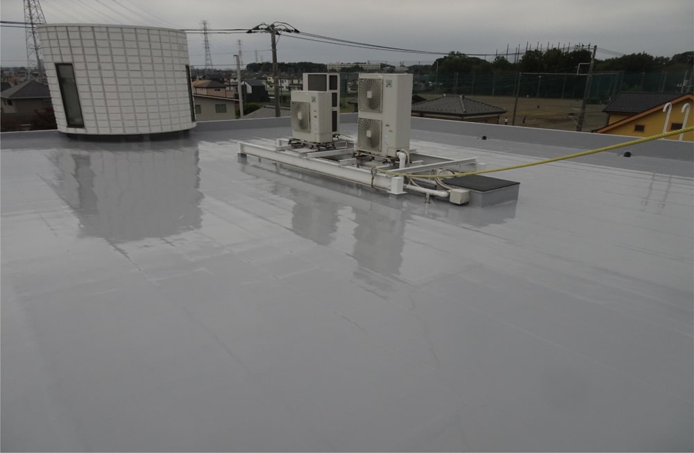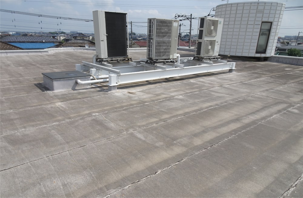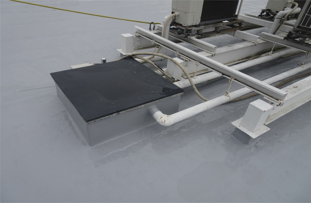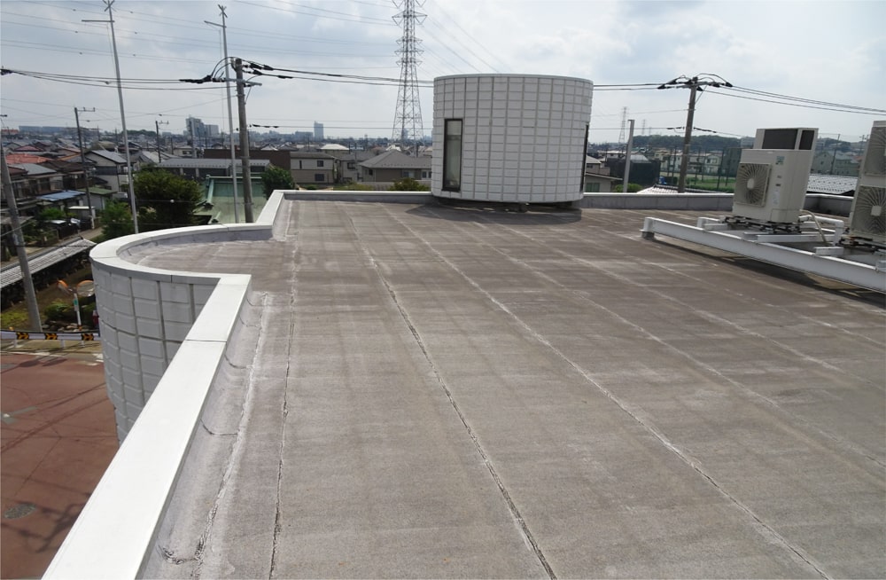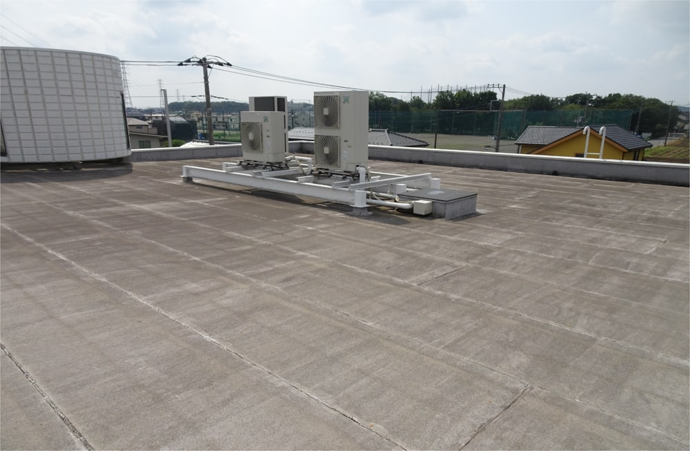 既存アスファルト防水⇒ウレタン防水で改修を実施致しました。既存の防水層の膨れなども多かったですが、下地処理を念入りに行い通気緩衝で施しました。