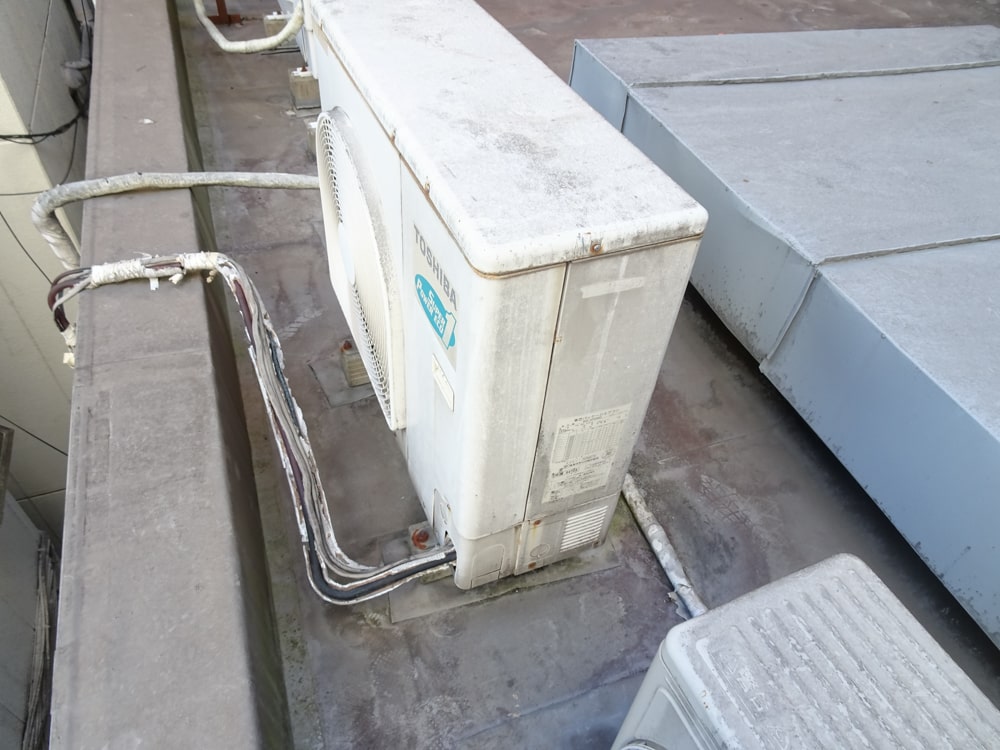 室外機置場が屋上で作業車が設置不可だった為、下から屋上までロープでの荷揚げ作業4人で見事に上げ下げが出来ました。職人さんお疲れさまでした。