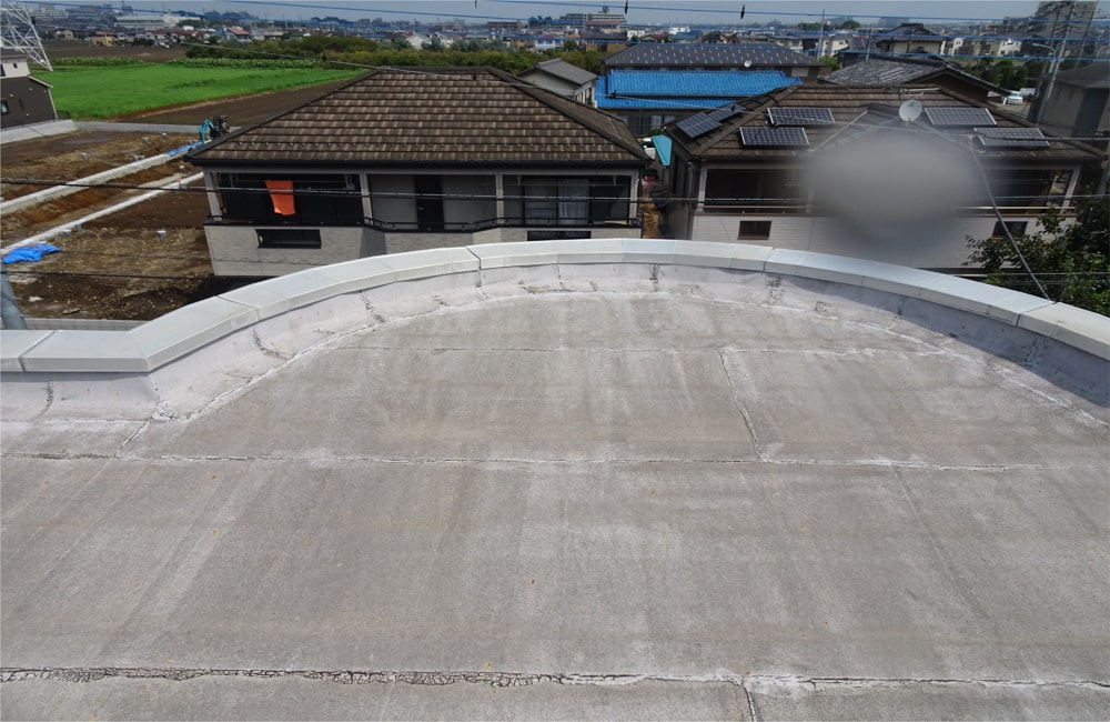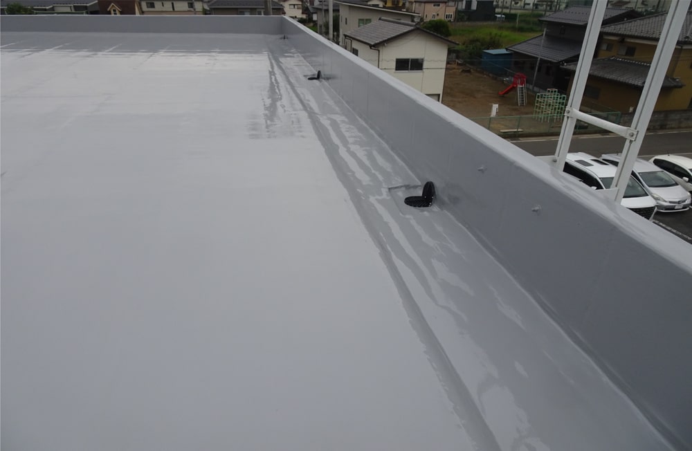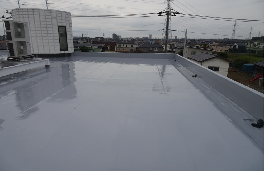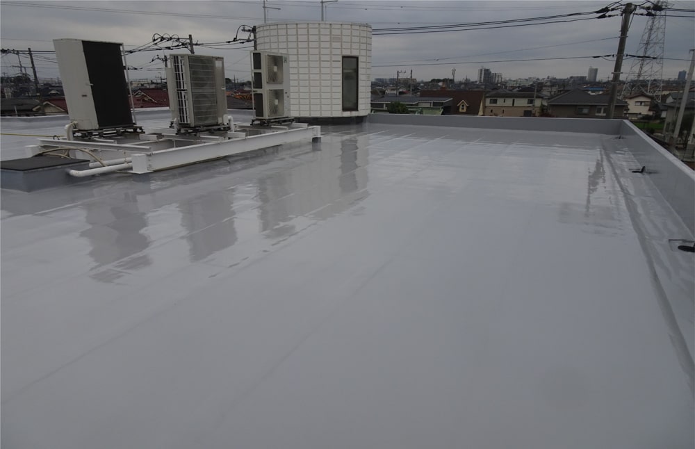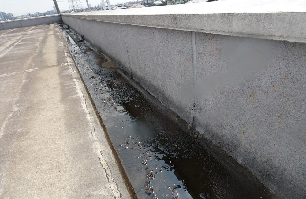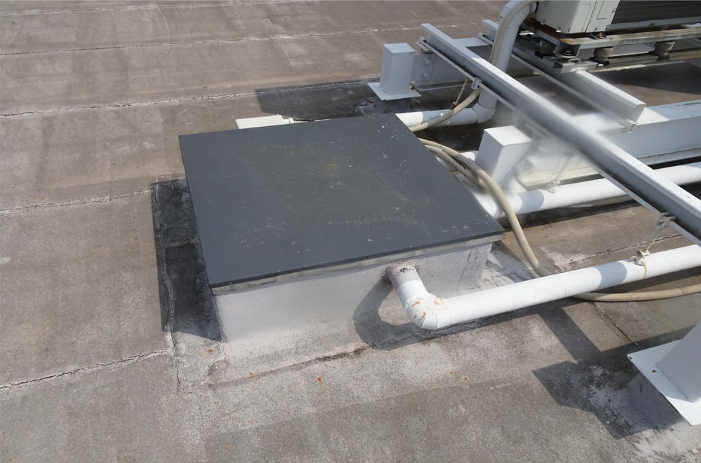 既存アスファルト防水⇒ウレタン防水で改修を実施致しました。既存の防水層の膨れなども多かったですが、下地処理を念入りに行い通気緩衝で施しました。